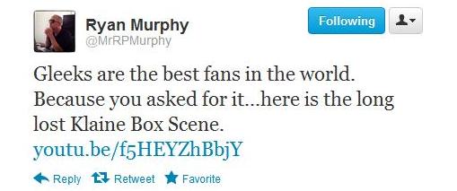 Glee’s creator and showrunner, Ryan Murphy, finally joined the world of Twitter earlier this week. He kicked his new account off by sharing pictures from the sets of both Glee and American Horror Story. And today he released a previously unaired scene from the season three episode, “Extraordinary Merry Christmas,” featuring the popular Glee couple, Kurt (Chris Colfer) and Blaine (Darren Criss), affectionately known as “Klaine.”